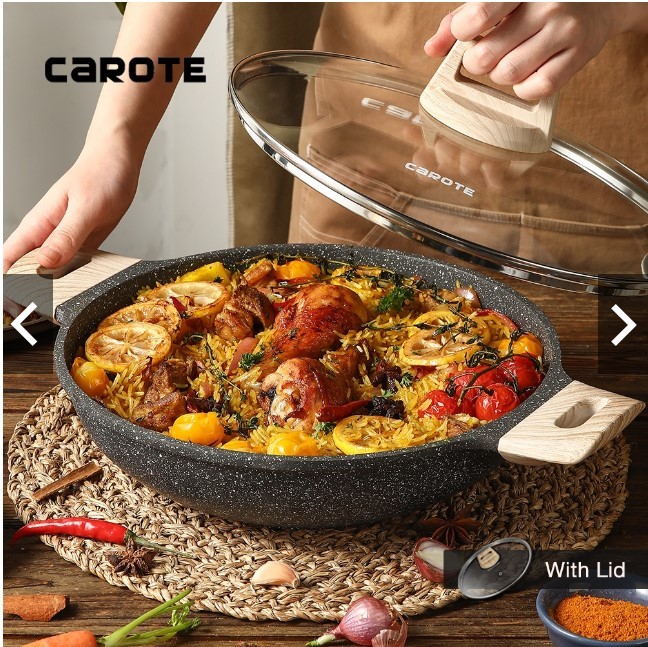 Carote Essential Woody Non-Stick Two-Handle Wok 24CM/28CM Stir Fry Pan Wokpan with Lid, PFOA Free Maifan Stone Non-Stick Coating From Switzerland, Suitable For Induction Stove